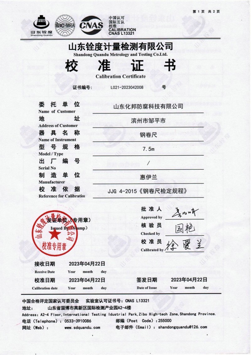 检测仪器报告证书:钢卷尺长度坚定报告